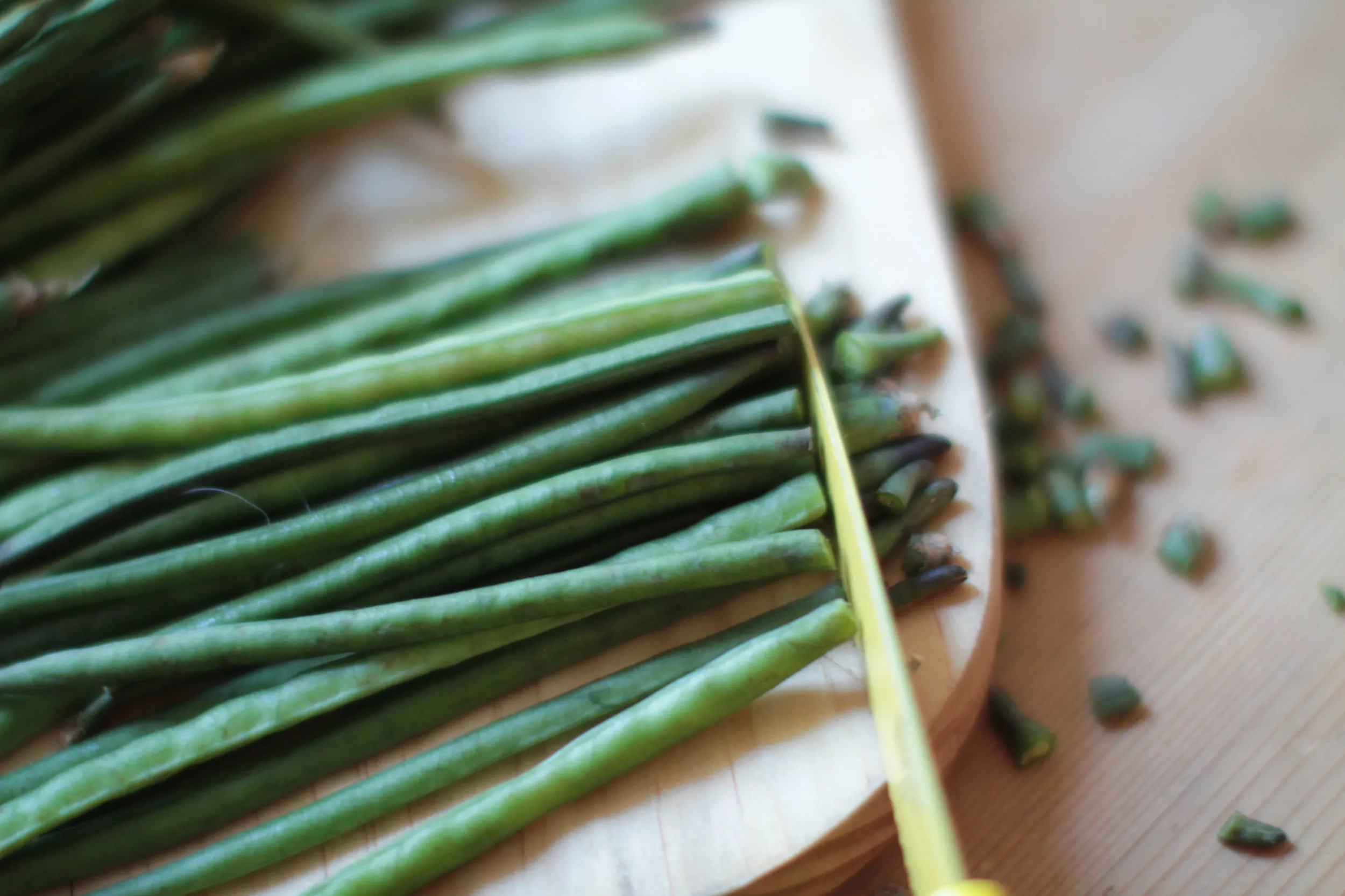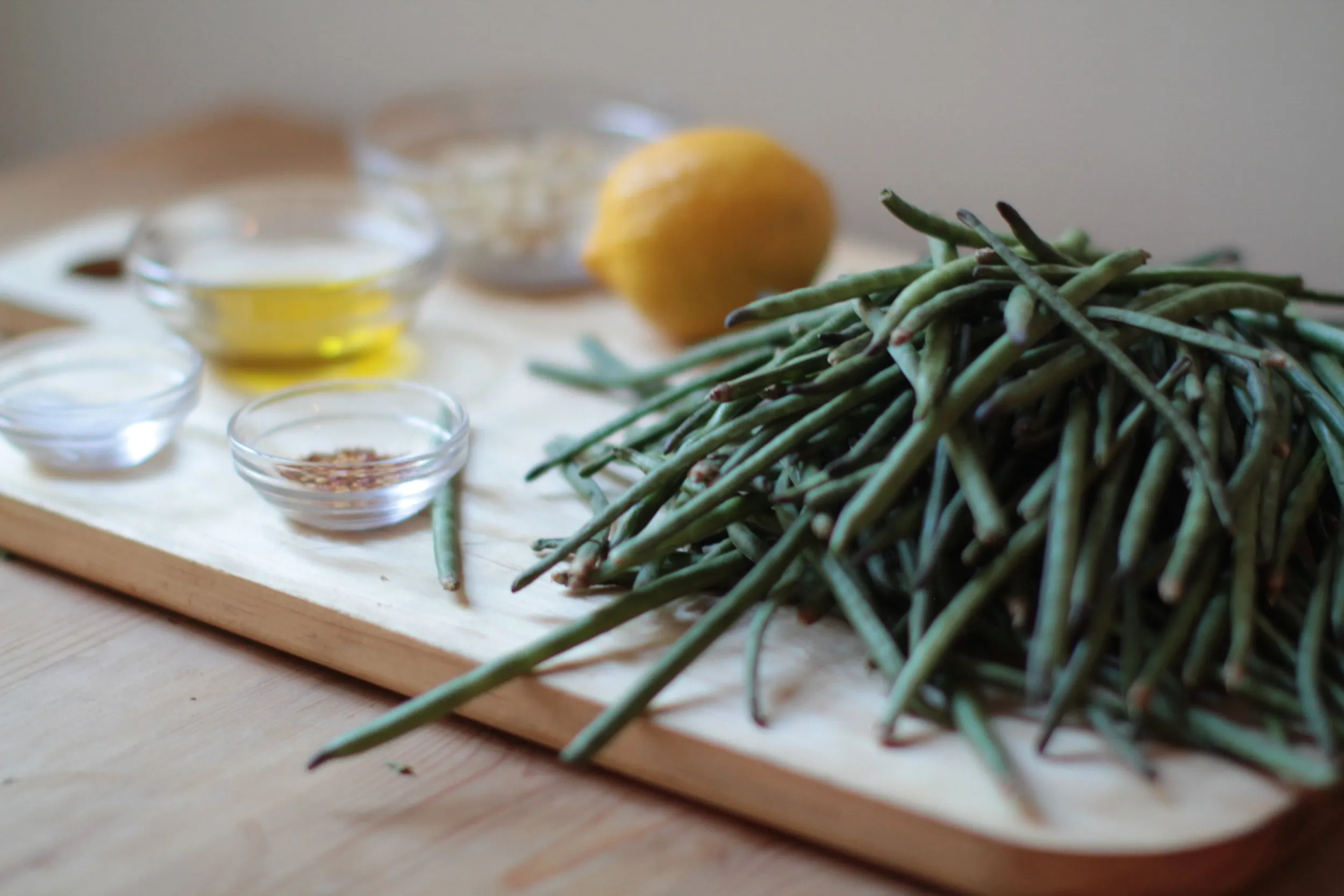 Note: I was taught to trim the beans one at a time, using the dull side of the knife more as a lever to break the end off than to cut it, so you can pull it backwards to get as much of the string off as possible. If you have the patience or company to sit around a table with while trimming beans, do that. You’ll get more tender beans. If you’re in a hurry or don’t feel like the extra effort—and if your beans are fairly young and thin—you can just cut off the ends without risking a stringy result. I like to line them up in a row to make them easier to disperse and flip once in the skillet.