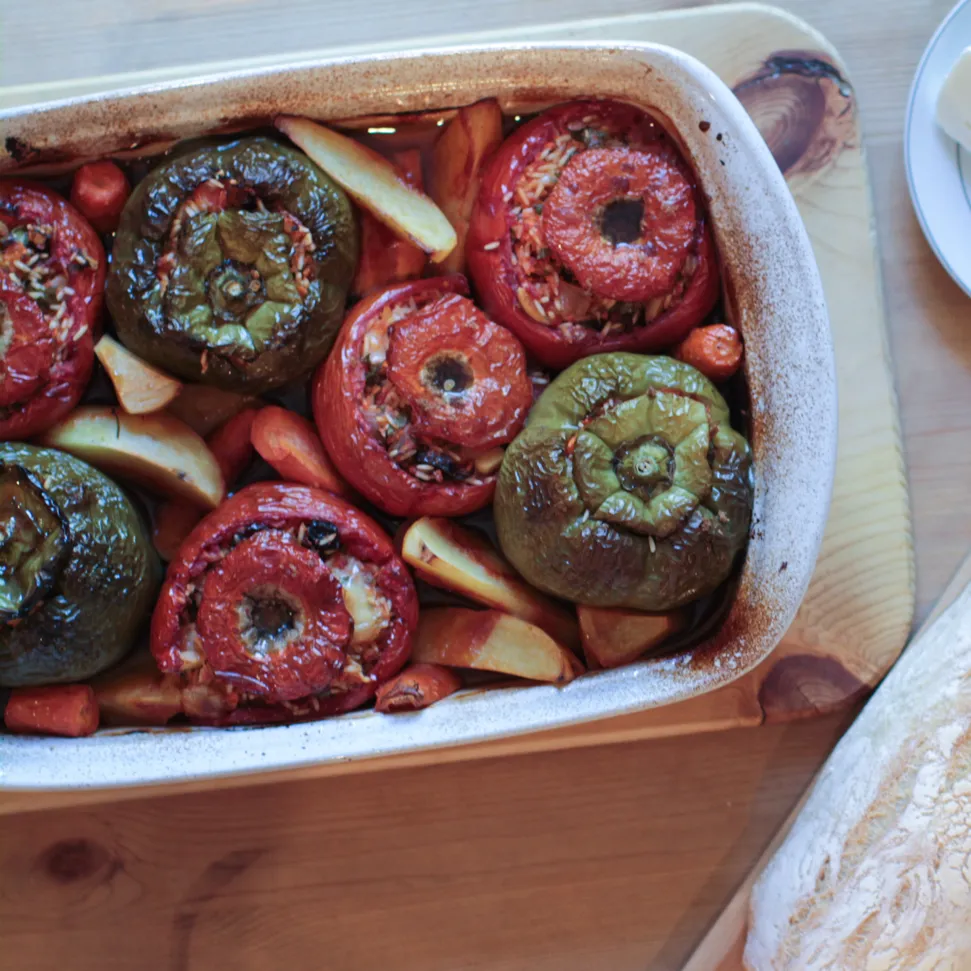 - 4 medium green peppers (if using a single 9x13” baking dish, you’ll only get 6-7 vegetables in total)