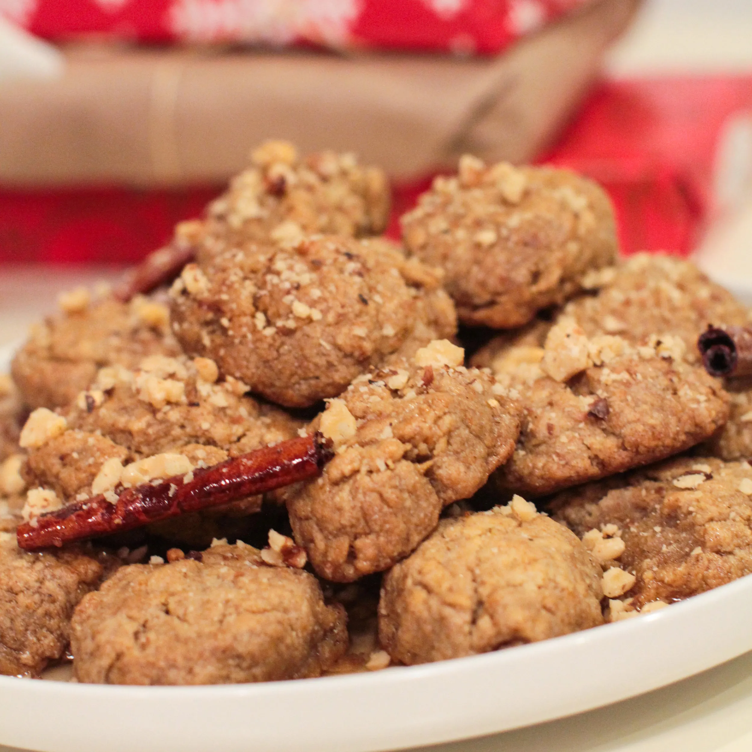 The singing of carols by children is a long-standing tradition in Greece. On the eve of Christmas, New Years and the Epiphany, children begin from sunrise by knocking on doors and asking a house’s occupants, “na ta poume?” meaning, “Shall we say them?” When residents agree, the children sing carols, and are then rewarded with a small gift. In older times the children were given sweets, dried fruits and nuts, today they are often given money—however some people still choose to serve them sweets, such as the cookie in this recipe called “melomakarouna.”