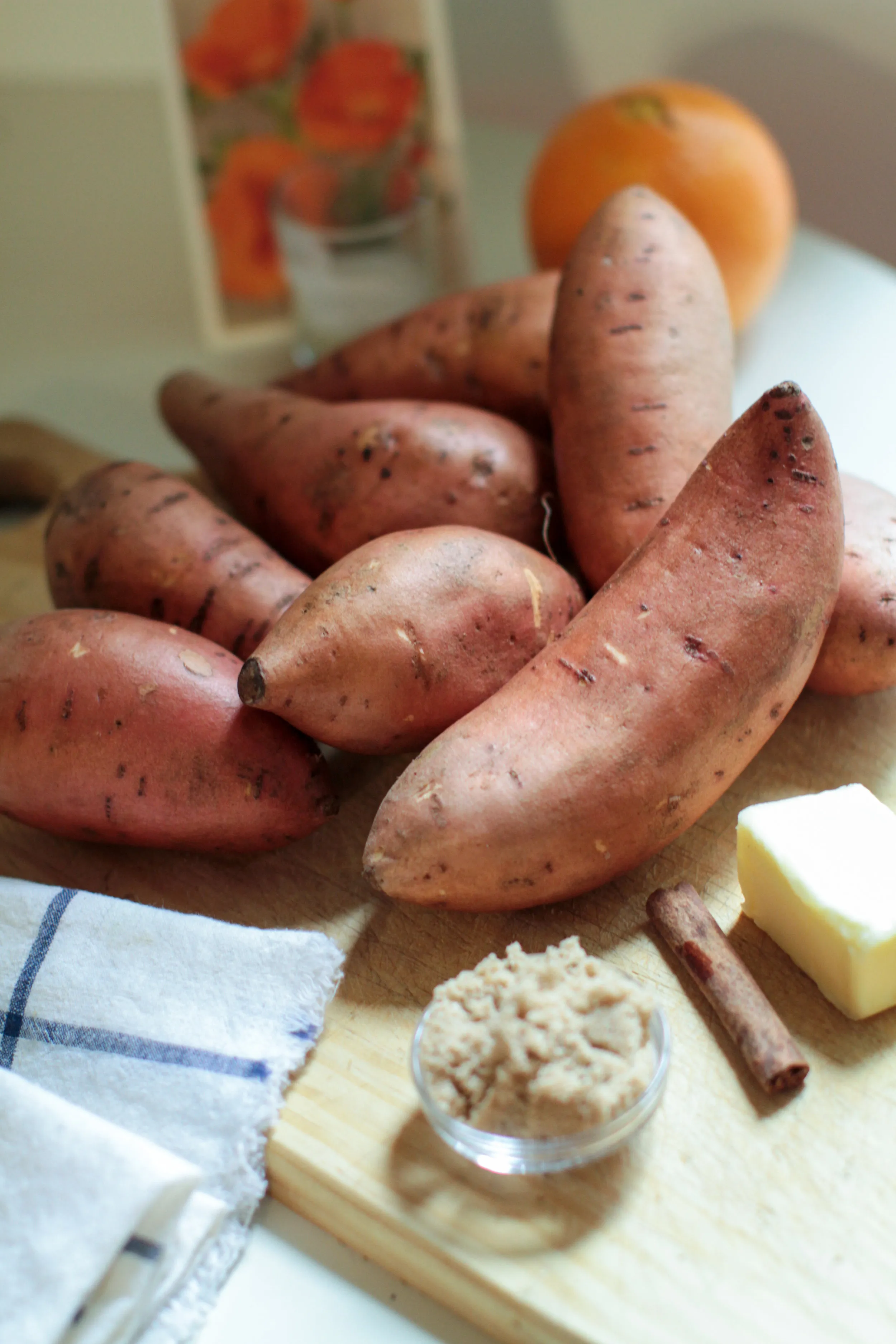 This pairing celebrates a favorite postcard of mine, bought on a trip to Muir Woods with my (now) husband. It is a vintage image of California poppies. The red poppy found in the Greek islands was always my favorite flower for its strong vividness paired with delicacy, and I never knew that an orange variety existed until Joseph introduced me to them in California. Just in time for Thanksgiving, the image pairs beautifully with a classic sweet potato mash. I adapted an Ina Garten recipe given to me by Tom Clarke, a fellow Marshall Scholar who brought this dish to the Marshall Scholar Thanksgiving Dinner celebrated annually by scholars while living in the U.K.. My family’s Thanksgivings tended toward the healthy, and a sugar-enriched dish like this was previously nowhere on my radar. It was a wonderful discovery that I recreate every year: worth the indulgence, enlivened with orange juice, full of flavor, this mash is the perfect creamy, buttery comfort to celebrate gratitude with. Happy Thanksgiving!